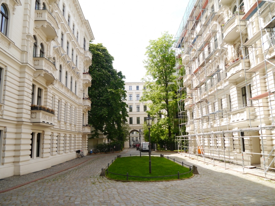 Das Grundstück liegt direkt neben dem denkmalgeschützten Ensemble „Riehmers Hofgarten“ – mitten in Kreuzberg, zwischen Yorckstraße, Hagelberger Straße und Großbeerenstraße. Die autofreie Umgebung sorgt für eine ruhige Wohnatmosphäre, trotz der zentralen Lage.