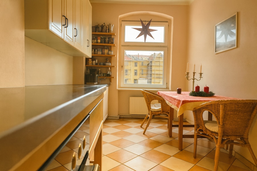 Die Küche blickt auf den grünen Innenhof und vermittelt ein sehr angenehmes Wohngefühl. Eine nette Hausgemeinschaft rundet das Bild ab.