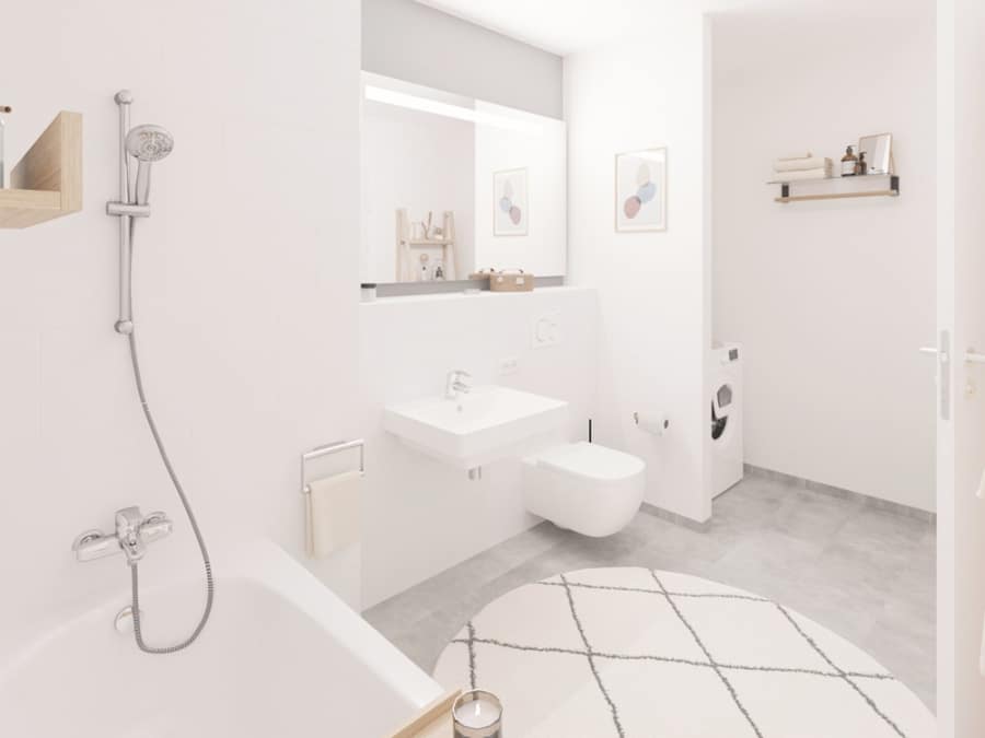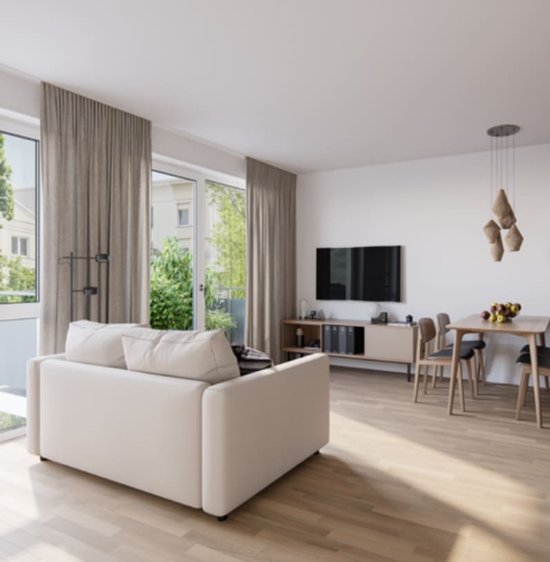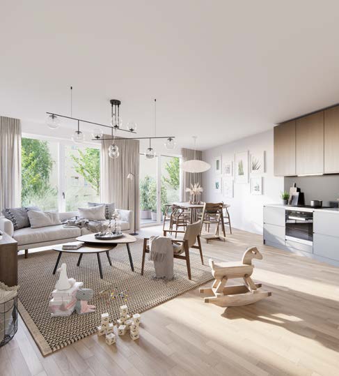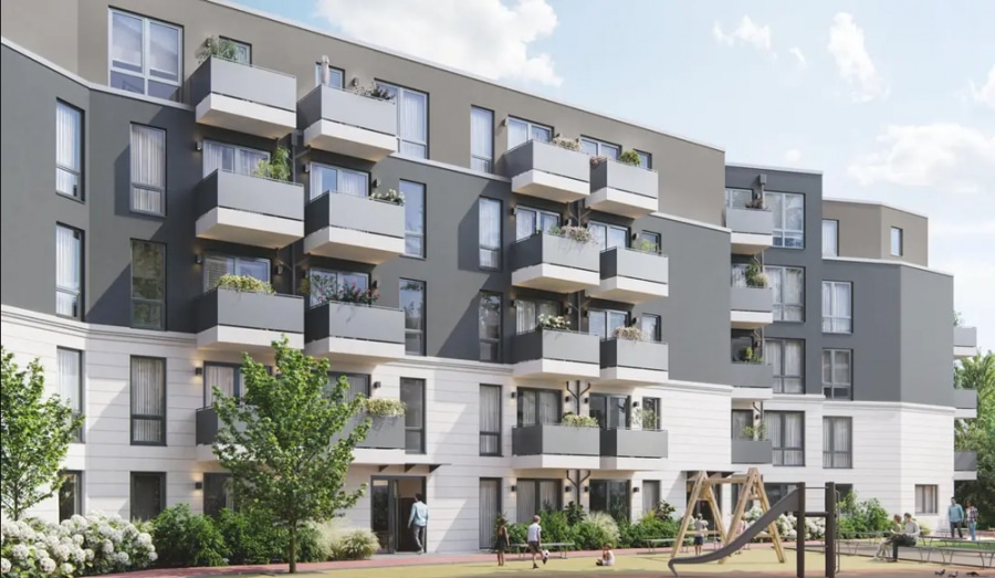 The building boasts a green inner courtyard and outdoor areas that offer plenty of space for neighborly get-togethers. Children can let off steam on lovingly designed playgrounds, while ample bicycle parking spaces in the building and in the courtyard enable sustainable mobility in the city. The apartments impress with real wood parquet flooring, underfloor heating for a cozy indoor climate and selected design elements in the bathrooms. The new building with a total of 91 apartments offers 1-4 room apartments with efficient floor plans, easily accessible by elevator.