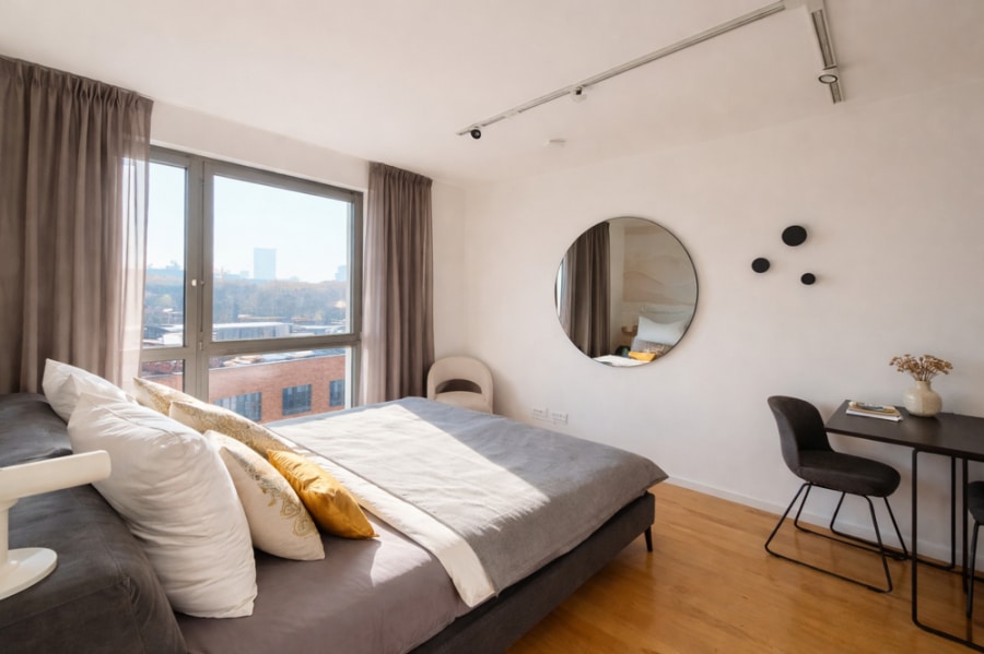 In the heart of the capital, in the heart of the neighborhood, in the heart of life: Whether it’s grilling with friends in the nearby Volkspark Friedrichshain, strolling through the flea market at Boxhagener Platz, or enjoying a drink at one of the many cozy cafés – Friedrichshain leaves nothing to be desired. And the location is perfectly connected: Alexanderplatz is just two U-Bahn stops or four tram stops away, the main station is directly accessible via the new U5, and the airport? You can reach the terminal by car in just 40 minutes. That’s Midtown living!