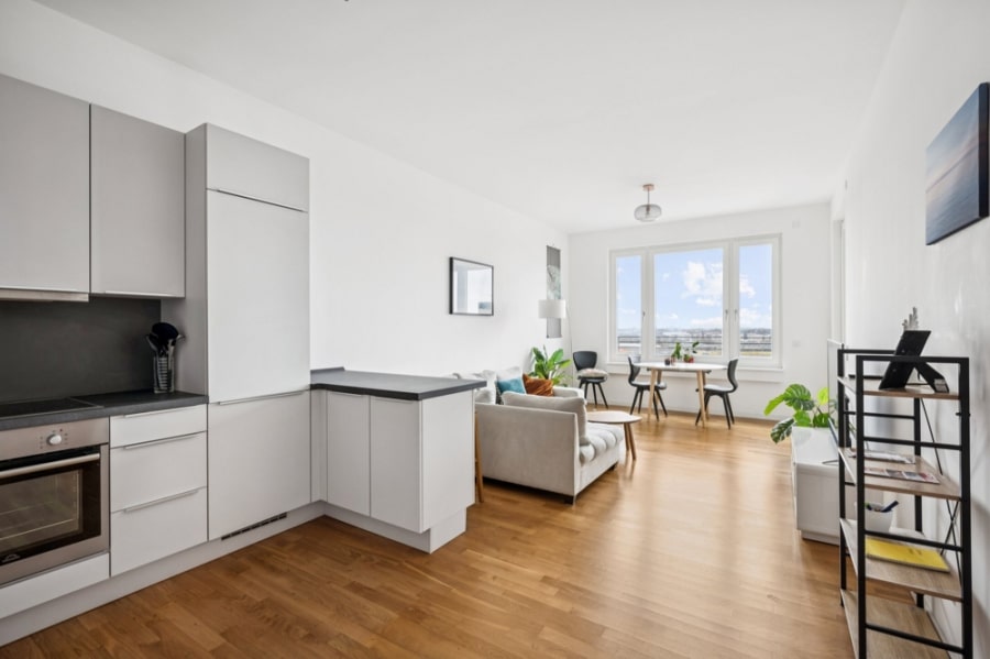Flooded with natural light, the property features a spacious open-plan living and kitchen area, thoughtfully designed for both relaxation and entertaining. The contemporary kitchen integrates seamlessly into the living space, creating a bright and inviting atmosphere, with expansive windows framing stunning views across the surrounding parkland.