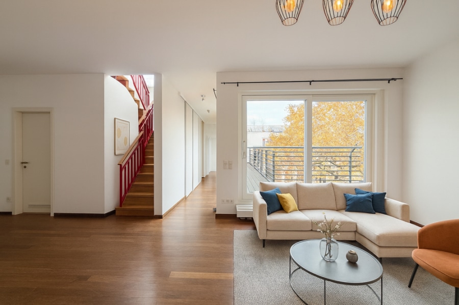 A striking internal staircase leads to the upper level, where a stunning rooftop terrace awaits. From here, you can enjoy panoramic views across Berlin’s skyline, including the Fernsehturm and the new Amazon Tower—an inspiring backdrop for dining, socialising, or simply unwinding above the city.